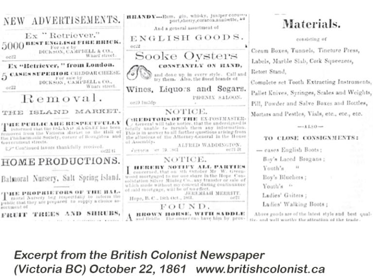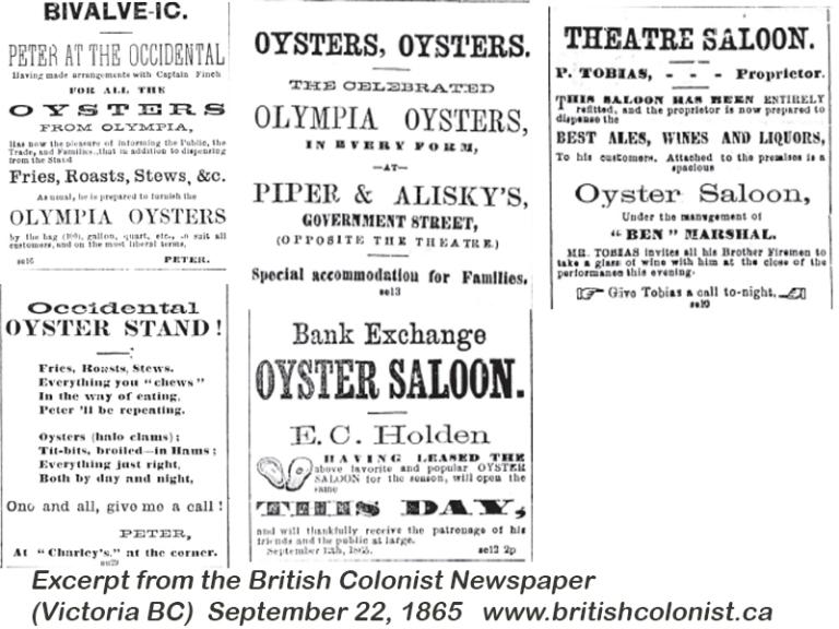 In 1861 – the first advertisement of oysters from Sooke, constantly on hand, appears for the Phoenix Saloon. The US Civil War is now underway and the Caribou Gold Rush begins. This is the first newspaper reference to where oysters are being harvested from.