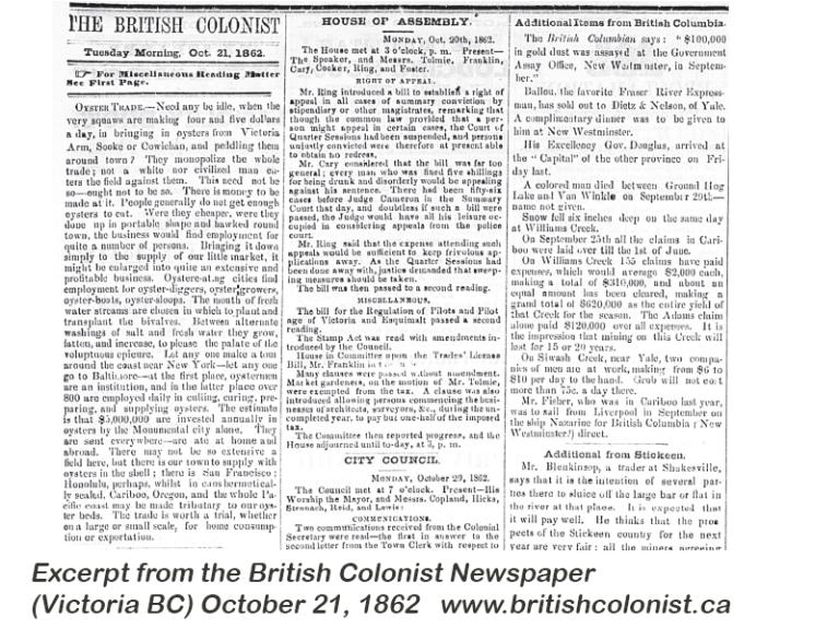 October 21, 1862 British Colonist: “OYSTER TRADE –Need any be idle when the very squaws are making four and five dollars a day, in bringing in oysters from Victoria Arm, Sooke or Cowichan and peddling them around town? They monopolize the whole trade; not a white nor civilized man enters the field against them. This need not be so – ought not to be so. There is money to be made at it. People do not get enough oysters to eat. Were they cheaper, were they done up in a portable shape and hawked round town the business would find employment for quite a number of persons. Bringing it down simply to the supply of our little market, it might be enlarged into quite an extensive and profitable business. Oyster eating cities find employment for oyster diggers, oyster growers, oyster-boats, oyster-sloops. The mouths of fresh water streams are chosen in which to plant and transplant the bivalves. Between alternate washings and salt and freshwater they grow fatten and increase to please the palate of the voluptuous epicure. Let anyone make a tour around the coast near New York – let anyone go to Baltimore – at the first place, oystermen are an institution and in the latter place over 800 are employed daily in culling, curing, preparing and supplying oysters. The estimate is that $5,000,000 are invested annually in oysters by the Monumental city alone. They are sent everywhere – are at home and abroad. There may not be so extensive a field here but there is our town to supply with oysters in the shell; there is San Francisco; Honolulu, perhaps whilst in cans hermetically sealed, Cariboo, Oregon and the whole Pacific coast may be tributary to our oyster beds. The trade is worth a trail. Whether on a large or small scale, for home consumption of exportation. “