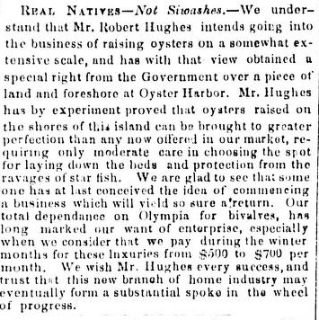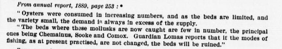 “Our oysters are of small size, and only taken in sufficient quantities to meet local demand. Owing to this, a great deal of those used to supply home consumption are imported from oyster beds in Olympia. These oysters are considered of better quality and finer flavour than our own, which is attributed to cultivation and care. Sometimes a few of the transplanted eastern oysters are imported from San Francisco. They are of good size and look healthy, but are not deemed as good as those taken fresh from the Atlantic. We have a number of defined beds on this coast, but for want of proper care and attention they have deteriorated and are now almost worthless.” [19] (p. 250)